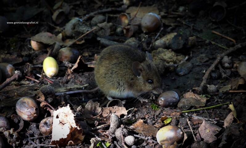 Tijdens een herfstwandeling, een muis onverstoorbaar tussen talloze eikels zien schransen.
