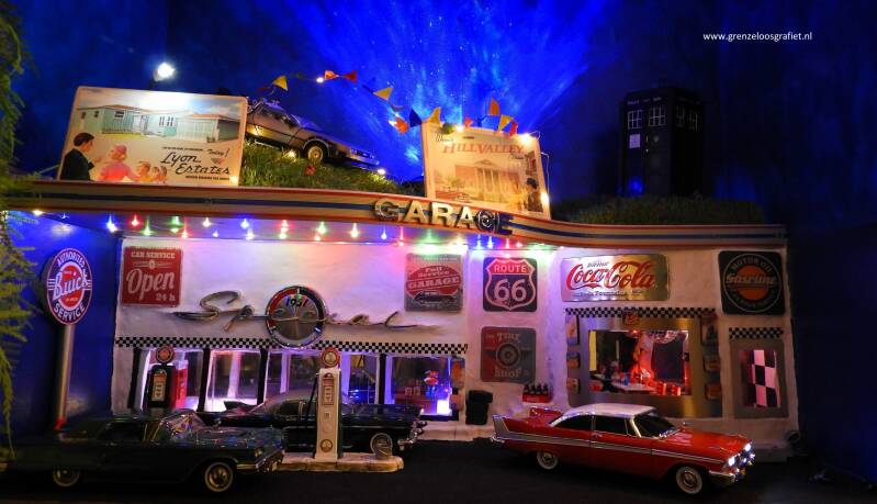 Onder: Geïnspireerd door de mooie oldtimers op schaalmodel, een sfeervol diorama gemaakt.