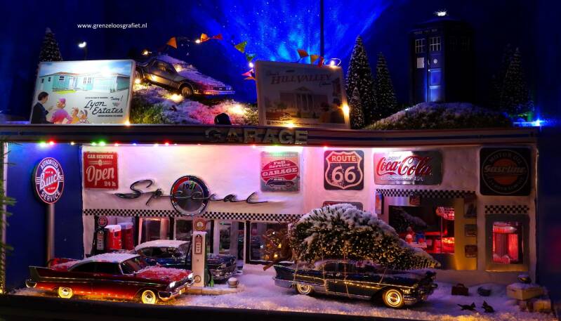 Onder; een zelfgemaakt diorama van een jaren 50 tankstation.