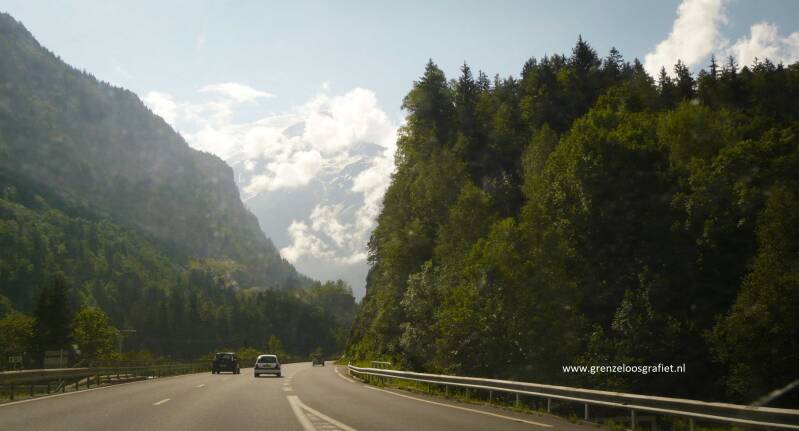 Op weg naar Chamonix, de Mont Blanc komt in zicht.