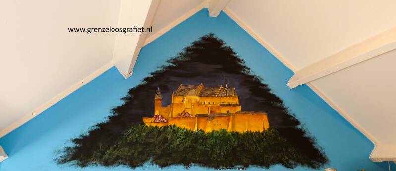 Hierboven: 24 juni 2012 heb ik een wandschildering van het kasteel op mijn zolder gemaakt.