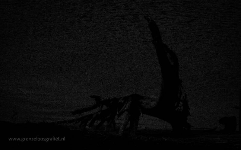 Een afgebladderde boomstronk, nog half in het water van het Zwarte Meer...