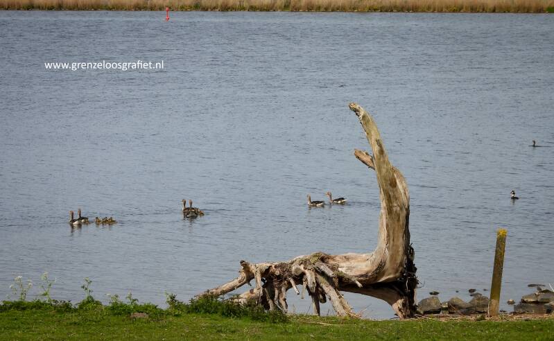 Deze plek is een paradijs voor vogels; alleen op deze foto al een aalscholver, een Fuut en ganzen met kuikentjes.