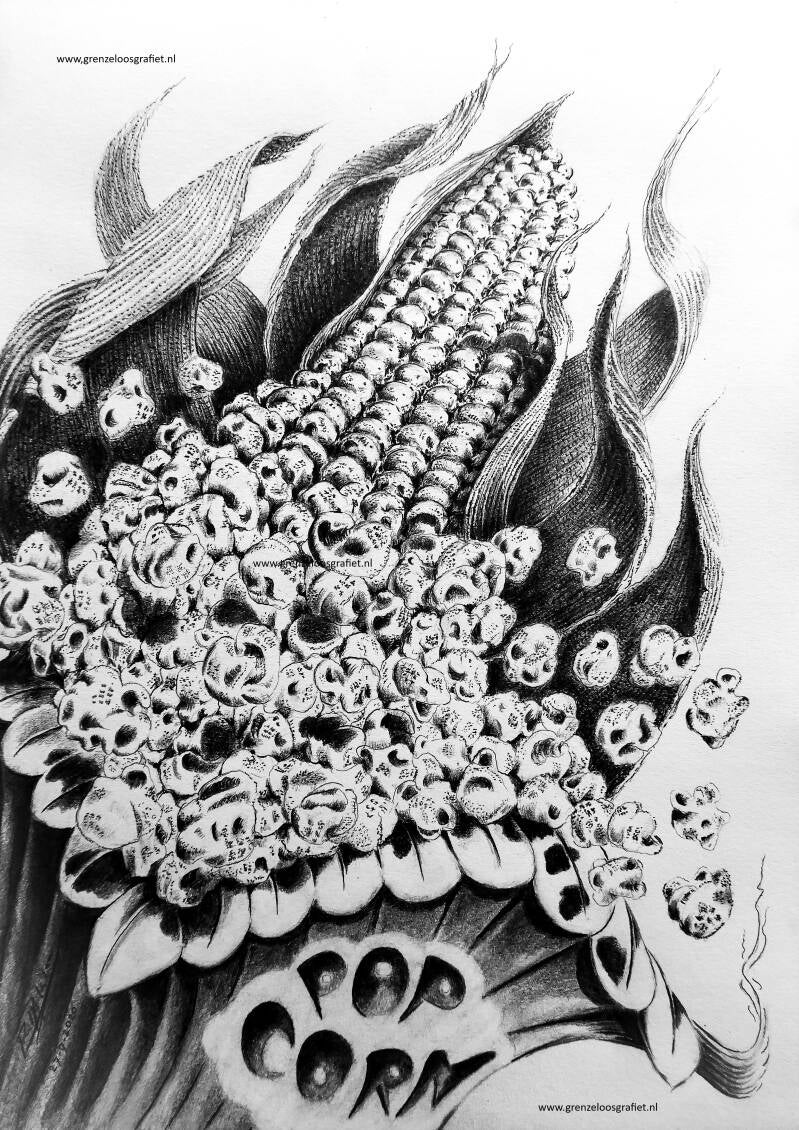 De metamorfose van Mais naar Popcorn wilde ik in deze tekening vangen.