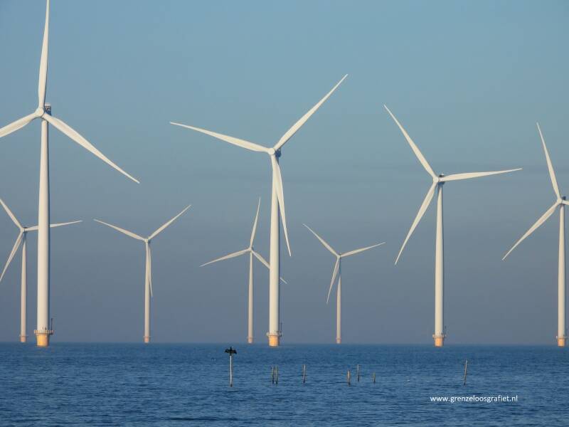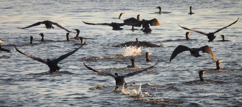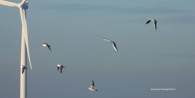 Onder en boven: Aalscholver en meeuwen bij Windmolenpark Noordoostpolder. 2022.