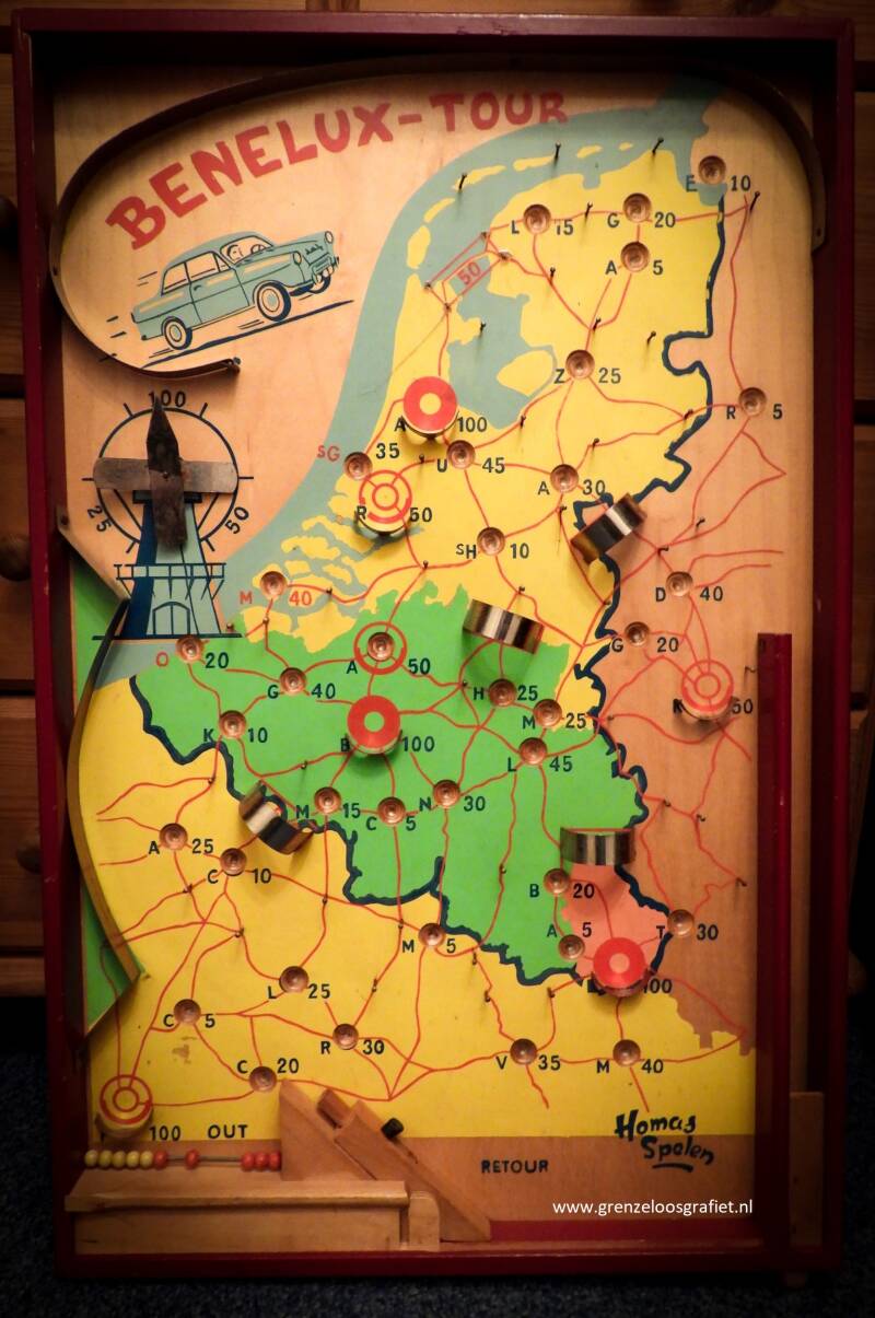Een oud knikkerspel in de vorm van Nederland, België en Luxemburg, uit ongeveer 1967.
