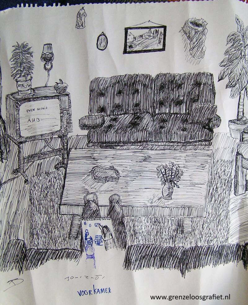 Één van mijn oudste tekeningen; was toen 14. Woonkamer ouderlijk huis. 30 12 1981.
